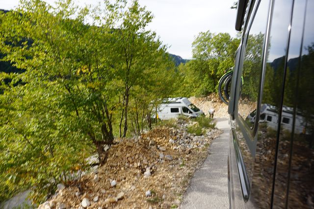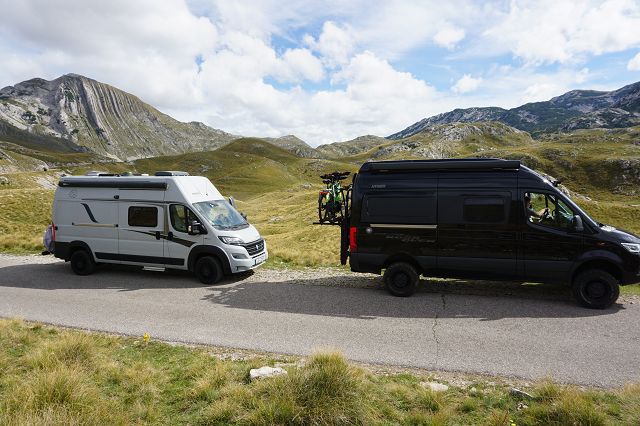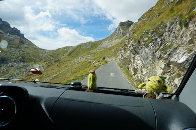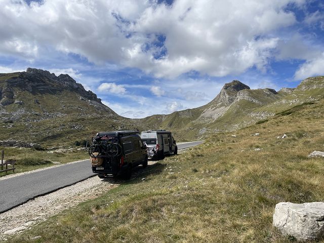 Besonders die schmalen Kehren sind ein Abenteuer, weniger für unseren 4×4-Fred, aber mehr für den Ducato unseres Reisebegleiters Georg, der in einer steilen Kehre erst nach einigen Anläufen weiterkommt (und nachdem wir den Schotter, der in der Kurve lag, größtenteils entfernt haben). Durchaus tricky! Jetzt verstehen wir, weshalb vor der Strecke besonders mit größeren Fahrzeugen gewarnt wird.