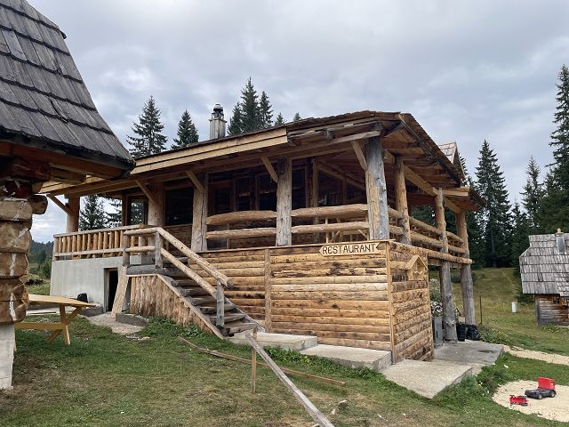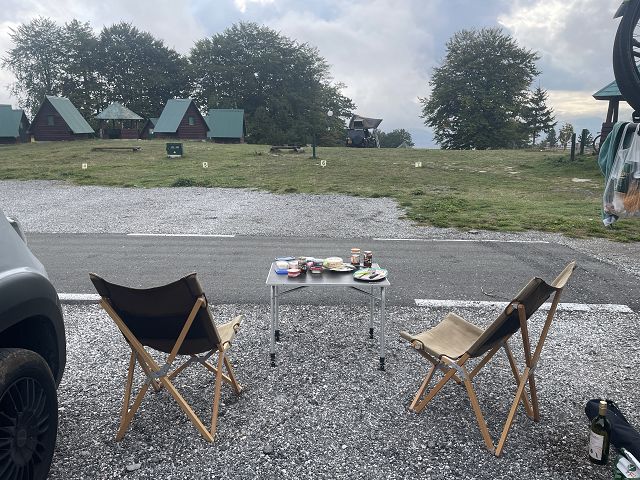 Wir wollen jetzt aber zurück auf die Panoramastraße Nr. 2 und zu einem Aussichtspunkt über die Tara-Schlucht, den wir am Tag zuvor zeitlich nicht mehr geschafft haben. Allerdings regnet es jetzt wieder in Strömen (zum Glück hatte ich für die Zipline genau die Regenpause getroffen!) und wir beschließen, erst mal Mittagspause zu machen. Und zwar im