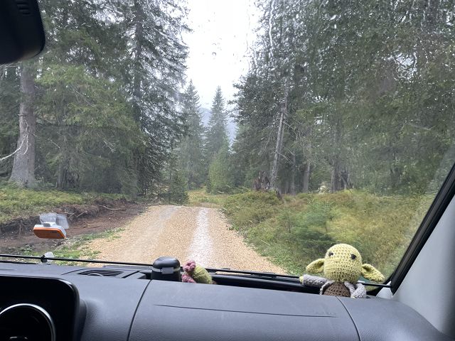 Als wir mit dem Essen fertig sind, hat es tatsächlich zu regnen aufgehört und wir fahren nur zwei Kilometer durch den Wald weiter zum