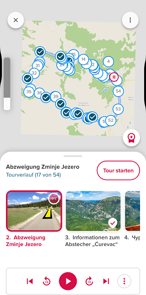 Auch für die Panoramastraße Nr. 2 „Durmitorring“ gibt es eine solche Reisebeschreibung. An 54 verschiedenen Punkten der Rundstrecke werden Reiseinformationen gegeben und Geschichte und Geschichtchen rund um das Durmitorgebirge erzählt. Super informativ und unterhaltsam! Der Haken? Der Audioguide ist für die Tour entgegen dem Uhrzeigersinn aufgebaut, weshalb die Texte manchmal ein wenig verwirrend sein können (z.B. „vor euch seht ihr nun ….“ obwohl wir das Motiv nun natürlich hinter uns haben). Aber mit ein bisschen geistiger Flexibilität ist das kein Problem. Die Geschichten und Erläuterungen machen die Fahrt auf jeden Fall nochmal interessanter!